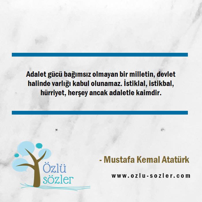 Adalet gücü bağımsız olmayan bir milletin, devlet halinde varlığı kabul olunamaz. İstiklal, istikbal, hürriyet, herşey ancak adaletle kaimdir.