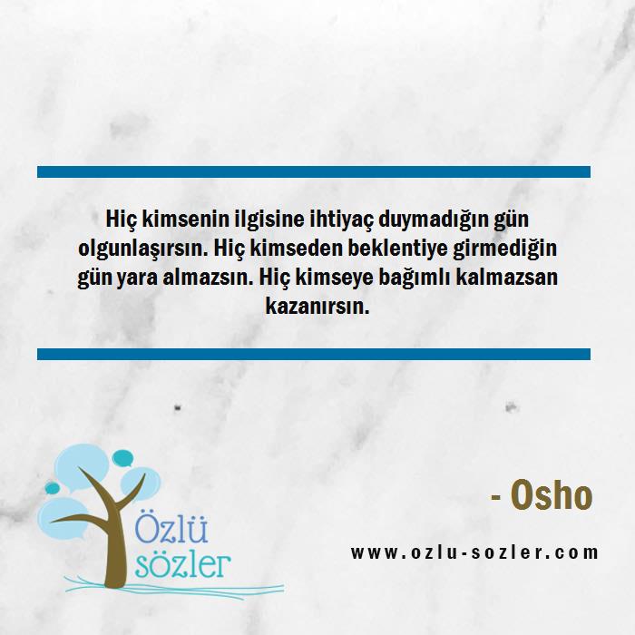 Hiç kimsenin ilgisine ihtiyaç duymadığın gün olgunlaşırsın. Hiç kimseden beklentiye girmediğin gün yara almazsın. Hiç kimseye bağımlı kalmazsan kazanırsın.