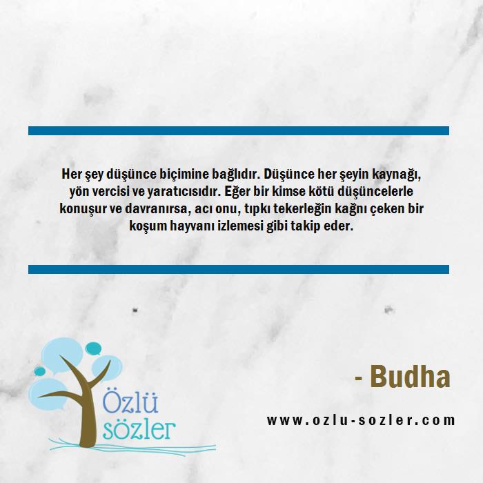 Her şey düşünce biçimine bağlıdır. Düşünce her şeyin kaynağı, yön vercisi ve yaratıcısıdır. Eğer bir kimse kötü düşüncelerle konuşur ve davranırsa, acı onu, tıpkı tekerleğin kağnı çeken bir koşum hayvanı izlemesi gibi takip eder.