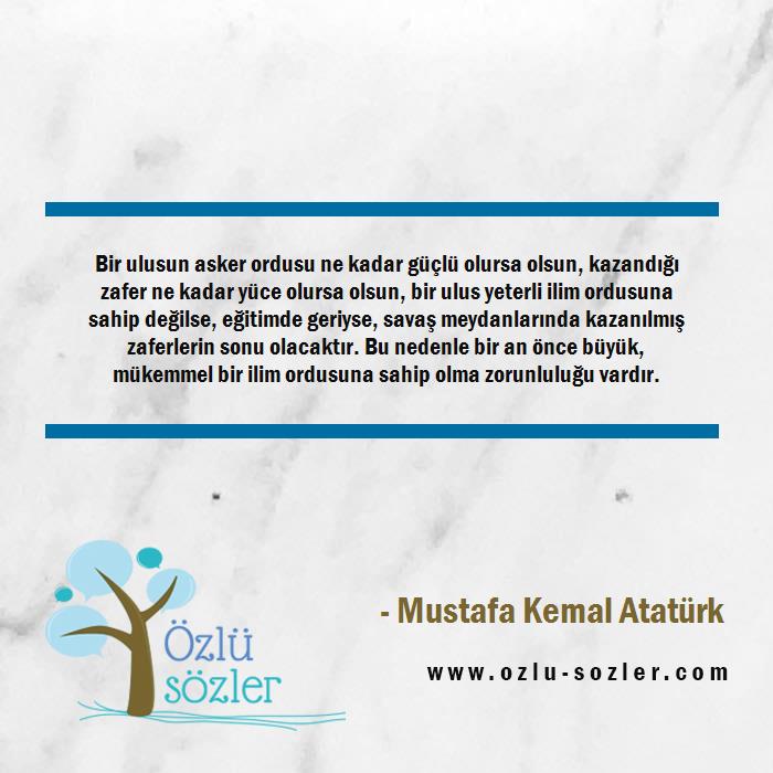 Bir ulusun asker ordusu ne kadar güçlü olursa olsun, kazandığı zafer ne kadar yüce olursa olsun, bir ulus yeterli ilim ordusuna sahip değilse, eğitimde geriyse, savaş meydanlarında kazanılmış zaferlerin sonu olacaktır. Bu nedenle bir an önce büyük, mükemmel bir ilim ordusuna sahip olma zorunluluğu vardır.