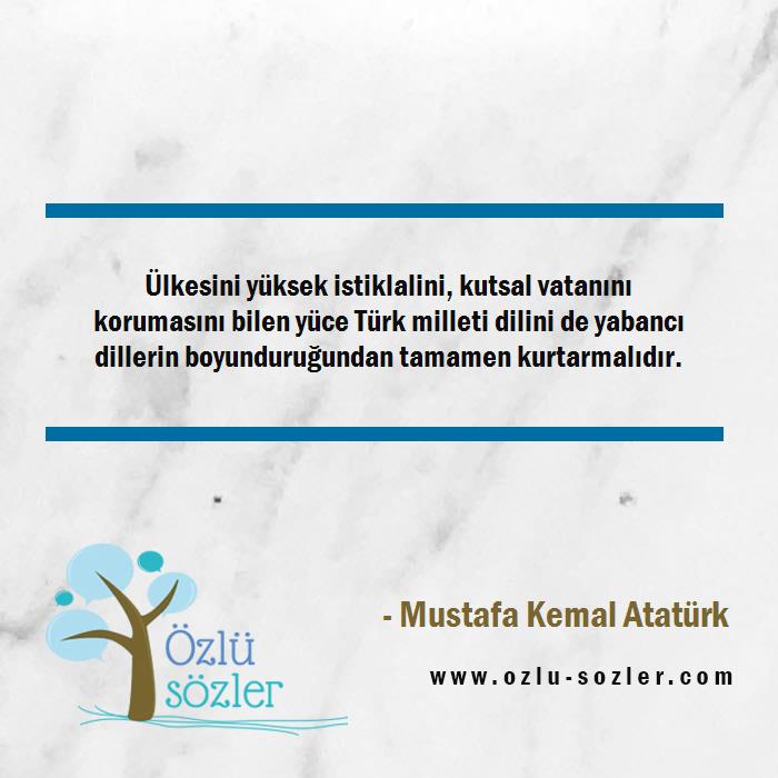 Ülkesini yüksek istiklalini, kutsal vatanını korumasını bilen yüce Türk milleti dilini de yabancı dillerin boyunduruğundan tamamen kurtarmalıdır.